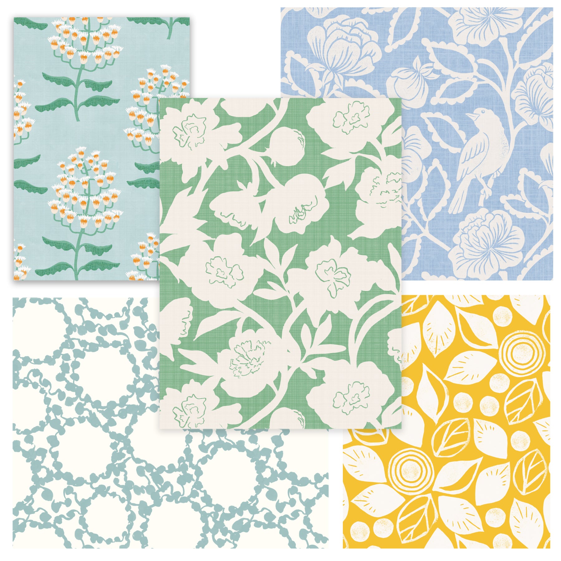 These prints come in a variety of styles, but all tell the same color story. Mix and match florals with geometrics, and round off with textured tonal and small scale prints.