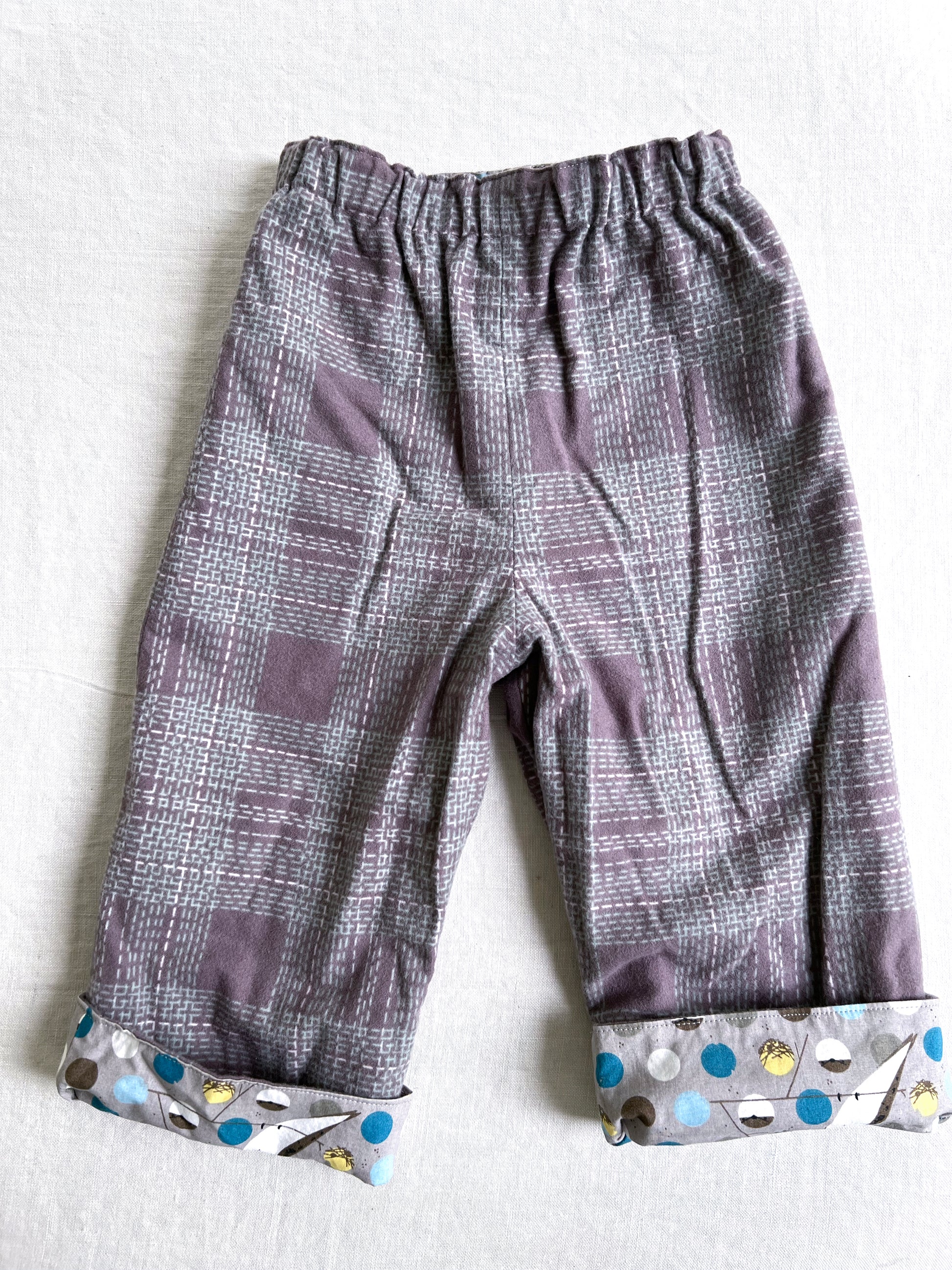 organic cotton reversible pants in barn swallow and plaid flannel