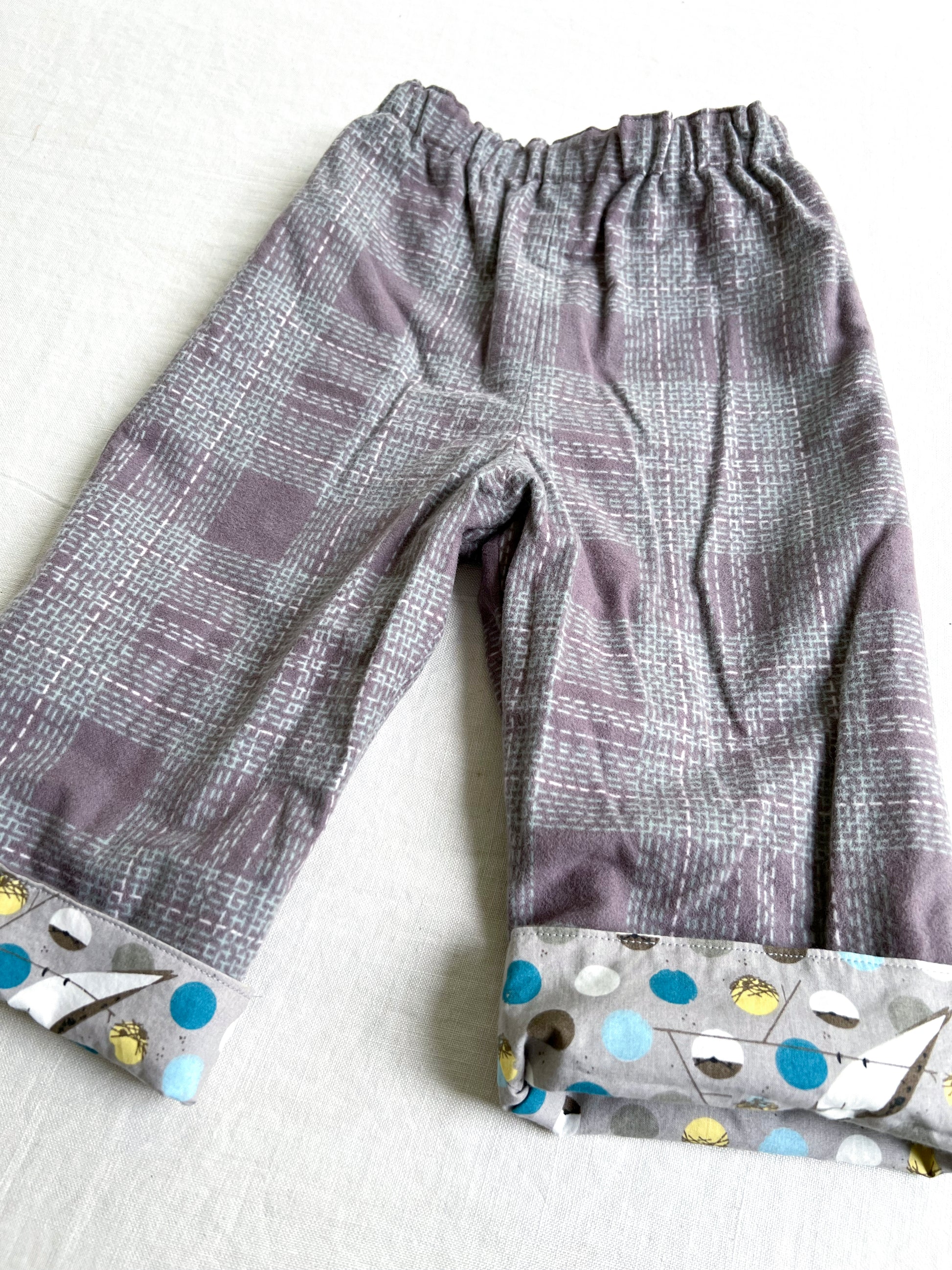 Whimsical, soft, organic, practical, and reversible! These pants are made with an organic cottons from Charley Harper. They can be worn with either side facing out, and are made with a little extra length so that you can turn up the cuff and see a little of the other fabric. A true two for one! They have an elastic waist band. Available in 18-24M.