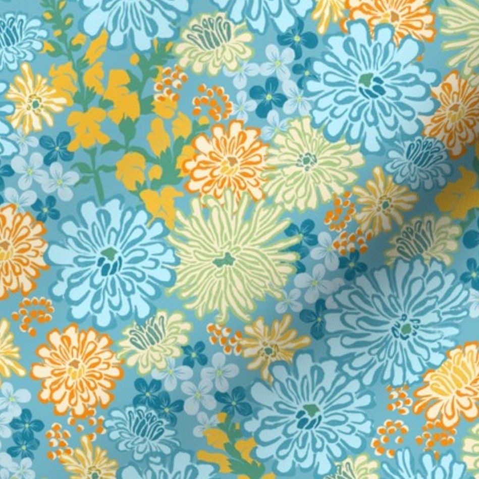 Zinnia and Snap Dragon Floral Teal Blue